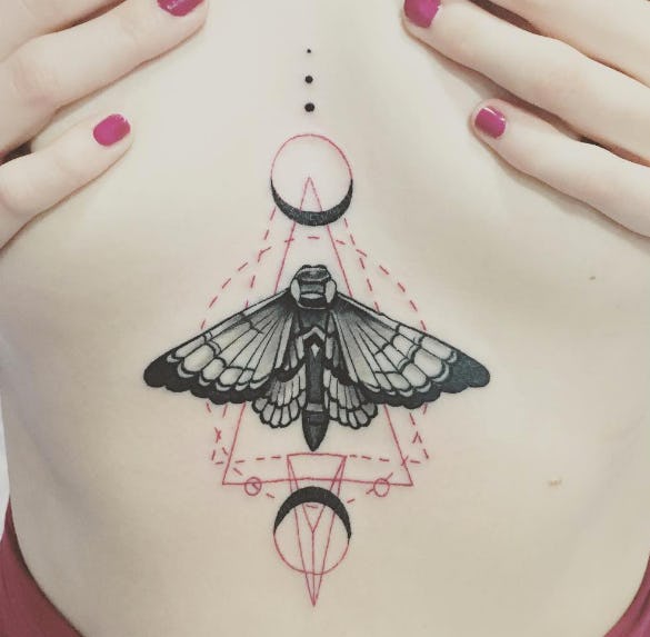 Татуировки могут простираться как под грудиной, так и располагаться между грудями. Ниже на фото рассмотрим самые красивые и оригинальные работы мастеров со всего мира.