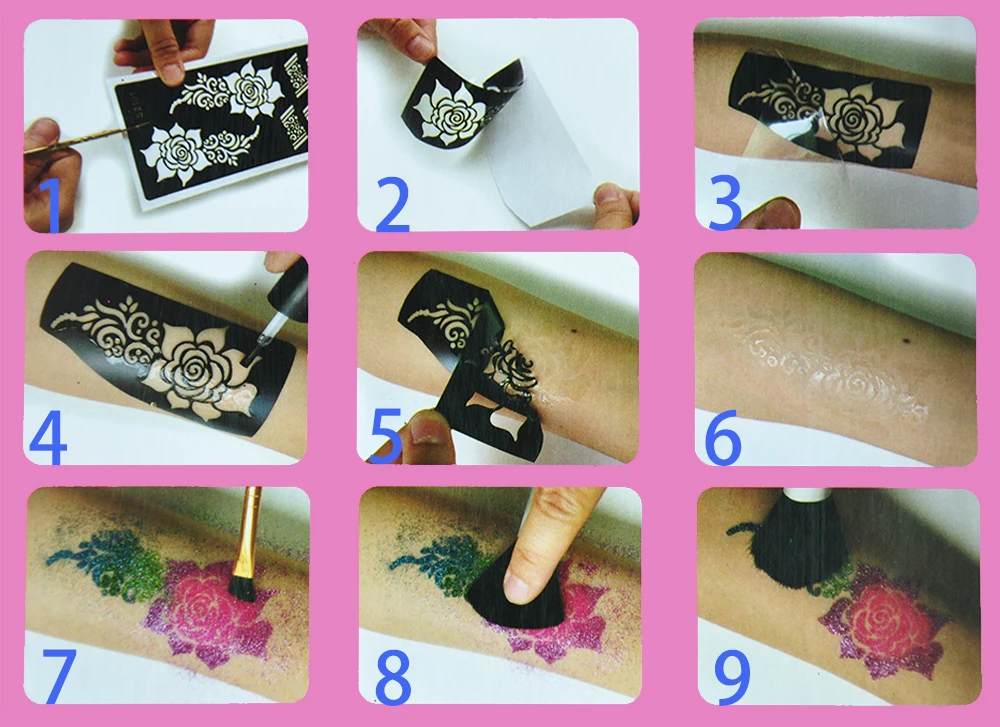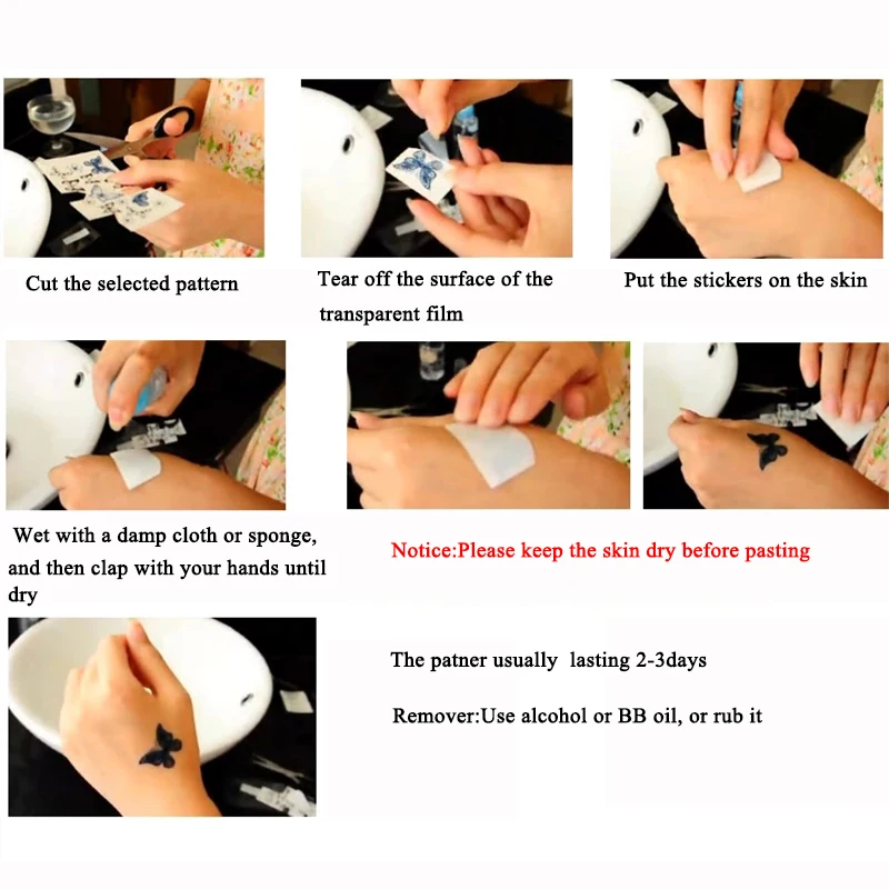 Лист кладут глянцевой стороной вверх, обводят контуры. Кожу смачивают спиртом, после чего прикладывают заготовку. Изображение должно отпечататься на месте тату.