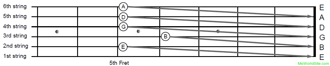 - Потяните струну А на 5-м ладу и позвольте ноте звучать.