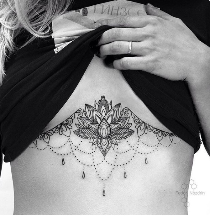 Татуировки под грудью, как правило, наносят представительницы женского пола любых возрастов, которые хотят и украсить тело, и в то же время скрыть рисунок от лишних глаз. Иногда благодаря нанесению рисунка под грудью скрывают некрасивые шрамы после операции или кожную пигментацию.