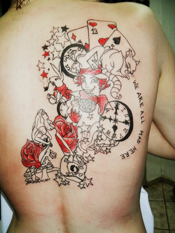 Образ Королевы Червей тоже является весьма распространённым среди тату, которым отдают своё предпочтение женщины. Эта харизматичная героиня на татуировке означает эксцентричность, стремление к власти, а иногда даже и некоторую истеричность. Такую татуировку обычно выбирают властные натуры, не желающие слушать других, которым свойственна импульсивность. Изображение, где присутствует безумный шляпник, символизирует яркость жизни, её насыщенность и полноту. Мартовский Заяц – это довольно странный герой. Он означает стремление к экстриму и острым ощущениям, для достижения которых человек готов совершать необычные для многих поступки.